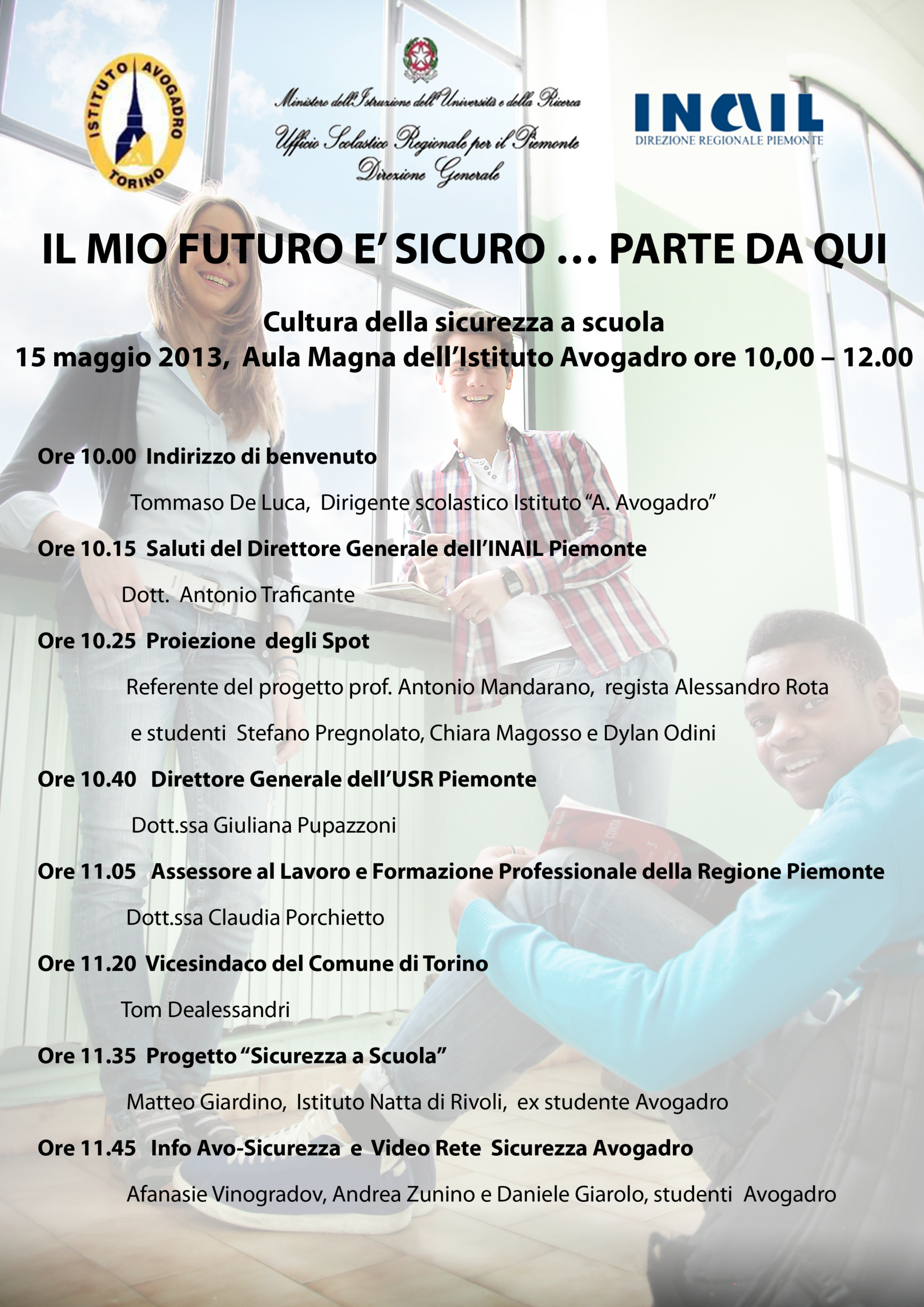 Il convegno sulla cultura della sicurezza a scuola “IL MIO FUTURO E’ SICURO….PARTE DA QUI” si terrà nell’Aula Magna dell’Istituto Avogadro, dalle ore 10.00 alle ore 12.00: Comunicato Avogadro