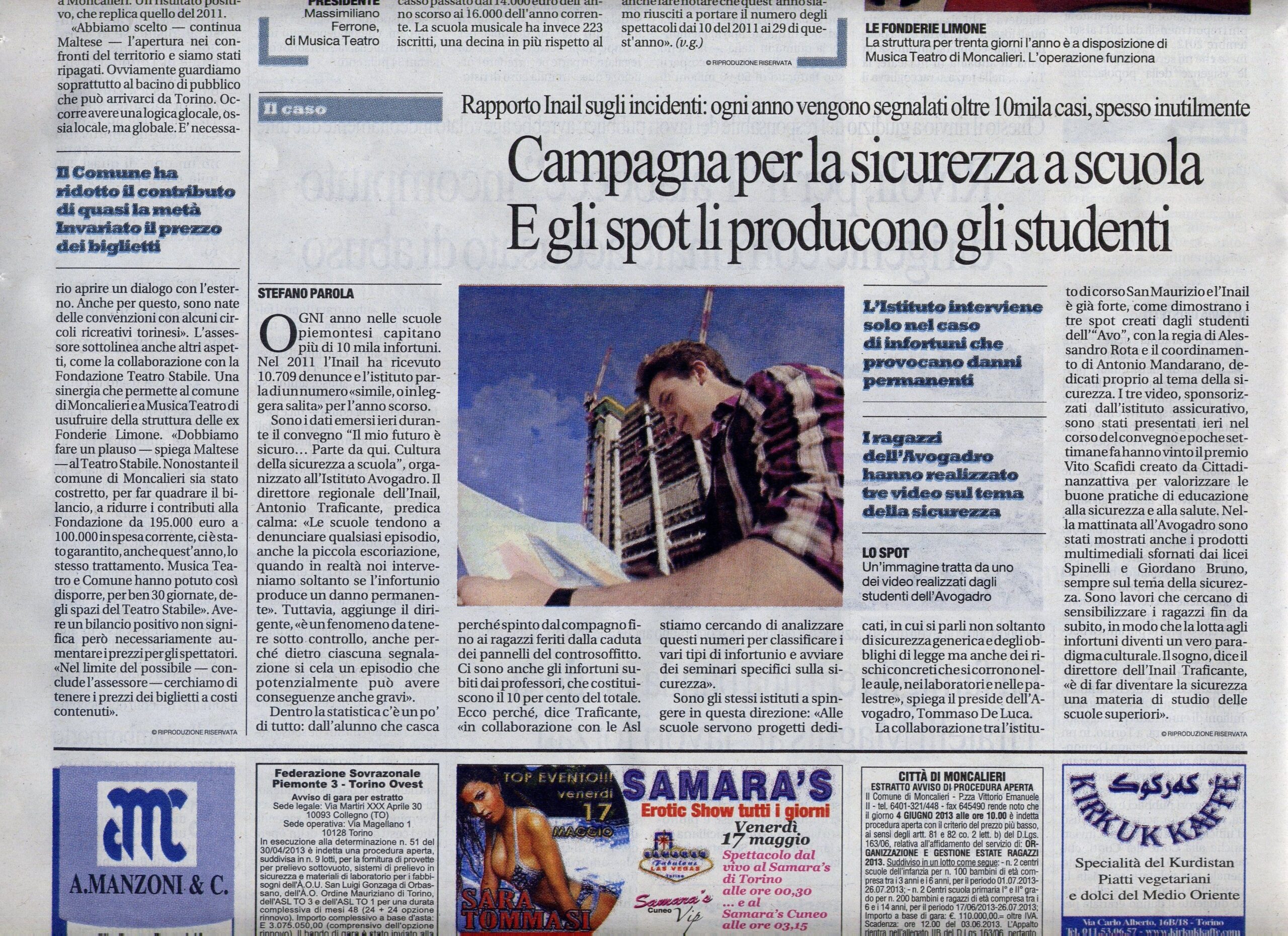 Il “Periodico per la promozione della salute e sicurezza nei luoghi di lavoro” ha pubblicato un articolo riguardante i tre spot creati dai ragazzi dell’istituto Avogadro,