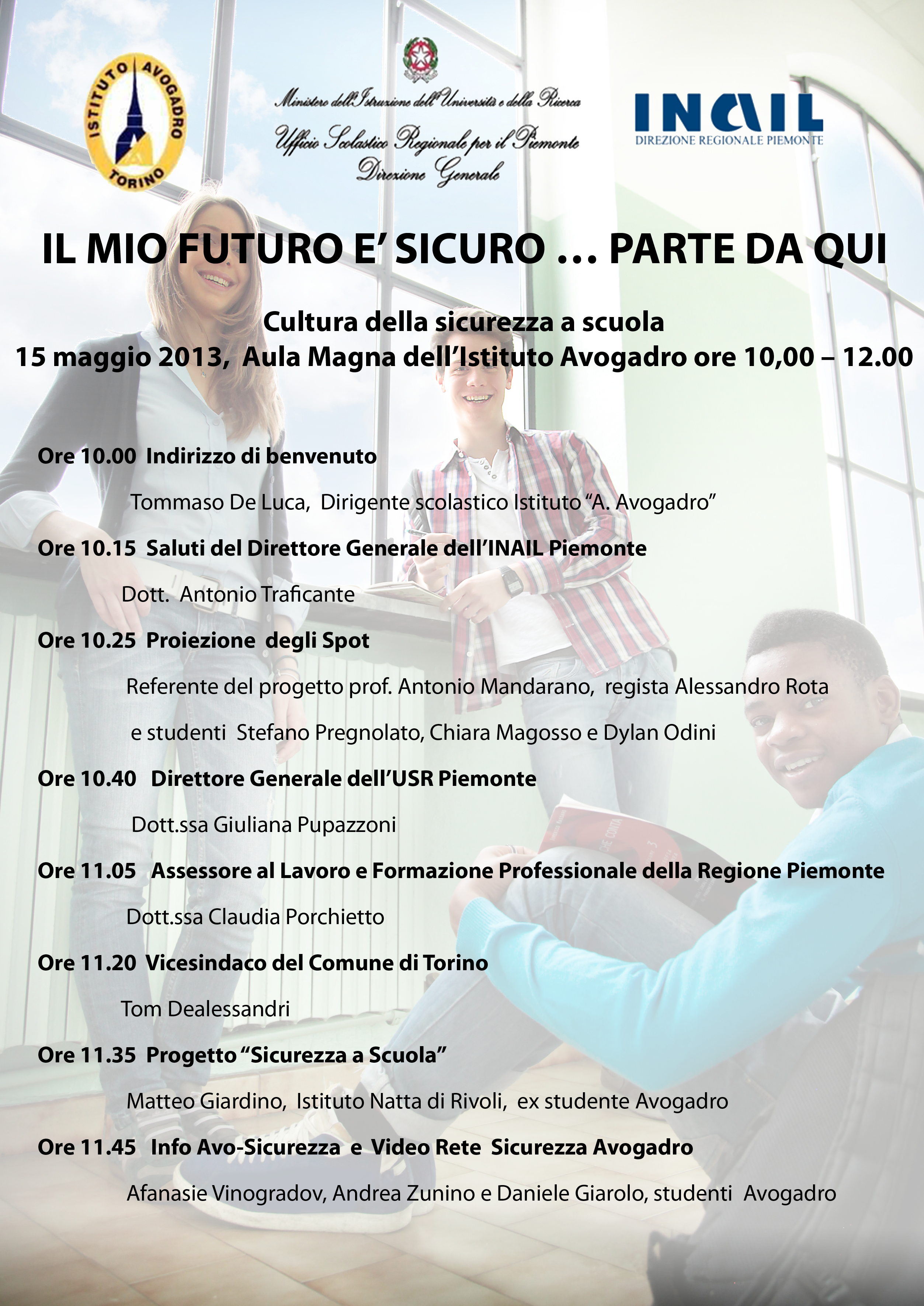 Il convegno sulla cultura della sicurezza a scuola "IL MIO FUTURO E' SICURO....PARTE DA QUI" si terrà nell'Aula Magna dell'Istituto Avogadro, dalle ore 10.00 alle ore 12.00: Comunicato Avogadro